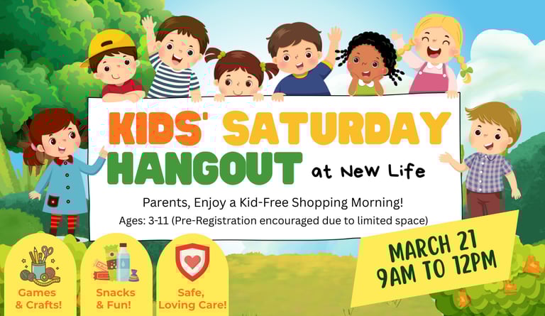 Join us for Kids’ Saturday Hangout at New Life on March 21 from 9:00 AM – 12:00 PM!